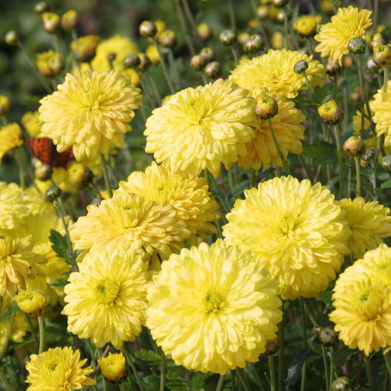 TuinchrysantHoogte tot 80cm.Bloem:dubbel,lichtgeel in september-oktoberZon,halfschaduwGeschikt als snijbloem7st.per m2