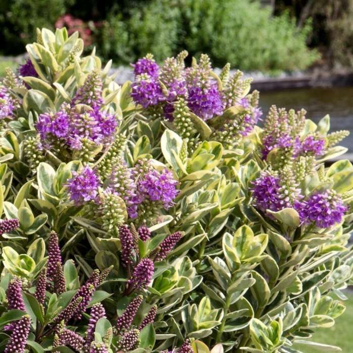StruikveronicaHoogte tot 50cm.Bloem:paars in juli-oktoberZon,halfschaduwBlad:GoudbontDoorlatende standplaatsGeschikt als kuipplantMatig winterhard