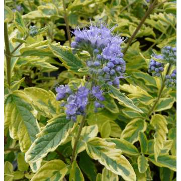 BaardbloemHoogte tot 125cm.bloem:violetblauw in juli-septemberBlad:geel bont gevlektZonhumusrijke,droge standplaatsGeschikt als solitair en vakbeplanting