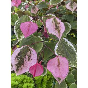 JudasboomHoogte tot 400cm.Bloem:hardrose in april-meiBlad:hartvormig,groen-wit gemarmerdZonGeschikt als solitair