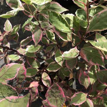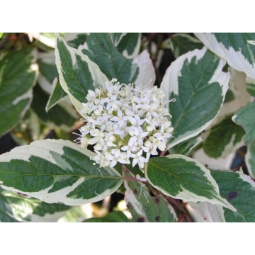 Witte KornoeljeHoogte tot 200cm.Bloem:wit in mei-juniBlad:groen met witte rand,in de herfst roserood verkleurendZonGechikt als solitair en vakbeplanting