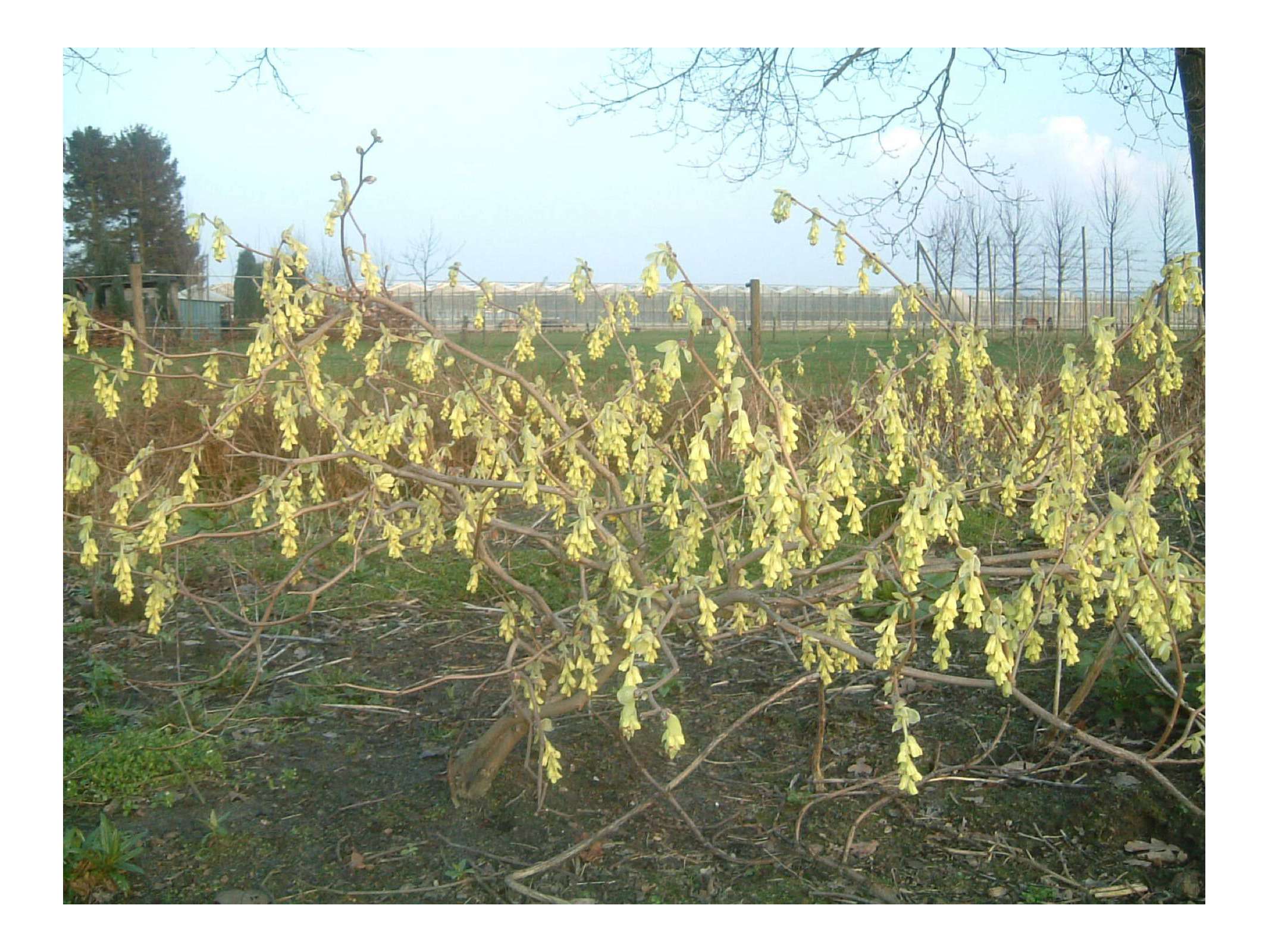 SchijnhazelaarBlad:5-10cm.,onderzijde behaardBloem:7-10cm.zachtgeel,welriekend in aprilFraaie solitair