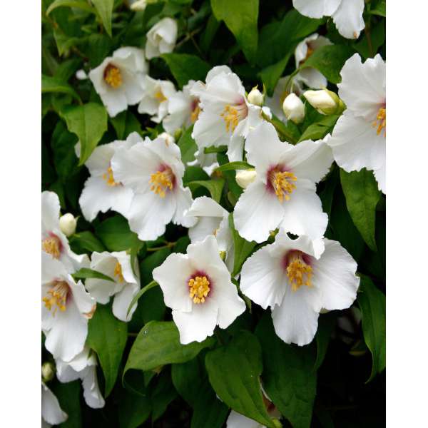 BoerenjasmijnHoogte tot 150cm.Bloem:wit met paars hartje in mei-juniZon,halfschaduwDoorlatende standplaatsGeschikt als solitair