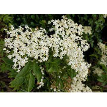 Gewone vlierHoogte tot 7 meterBloem:in schermen,wit in juni-juliBessen:zwart,eetbaarZon,halfschaduw,schaduwBijen lokkend