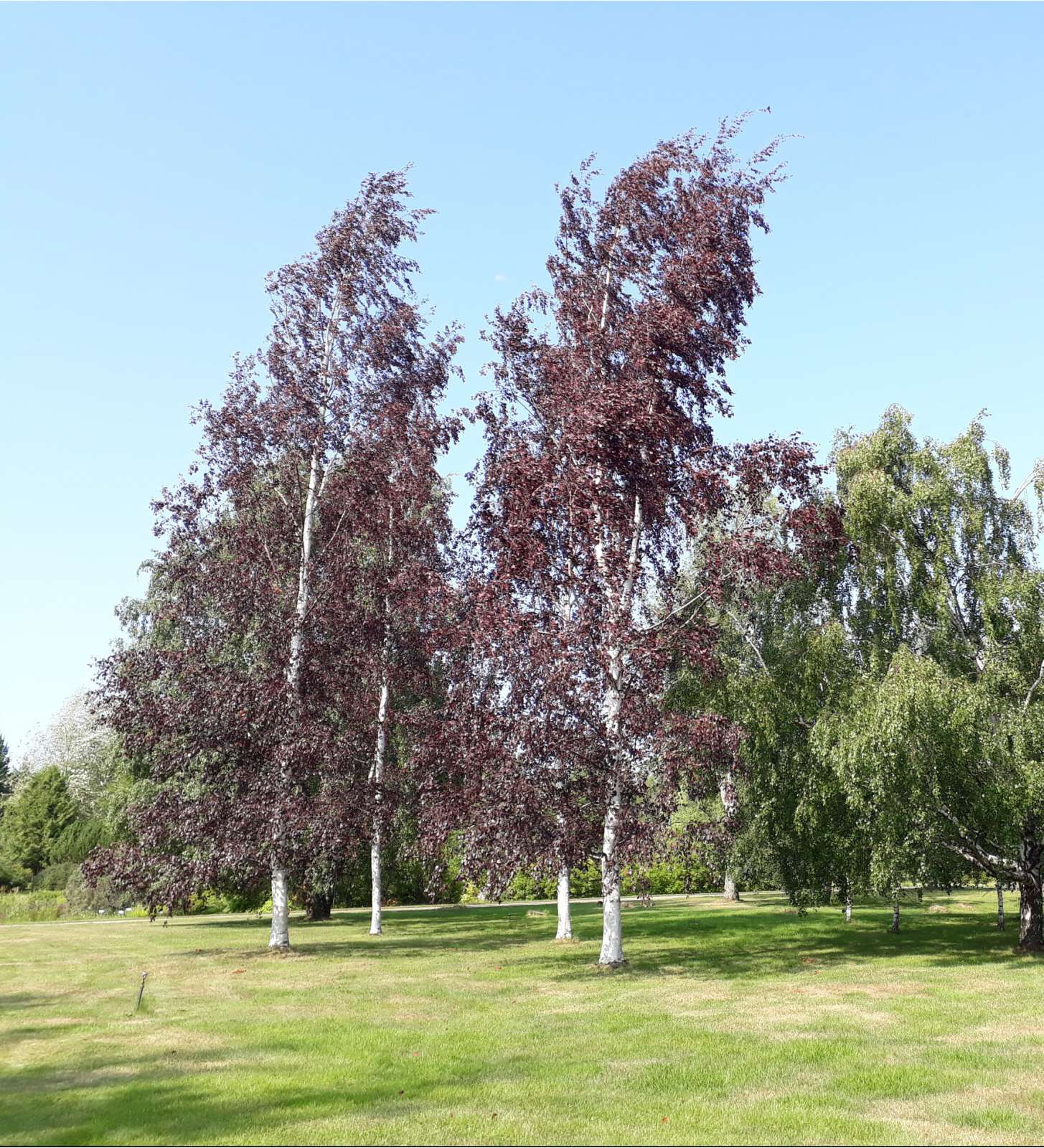 Rode Ruwe BerkHoogte tot 10 meterKroon:ovaalvormigBlad:purper,rood uitlopendBloem:geelgroen in maart-aprilStam:wit