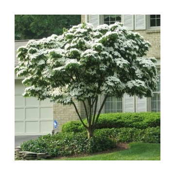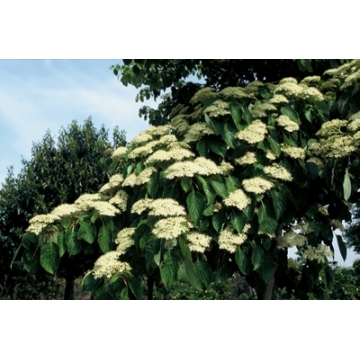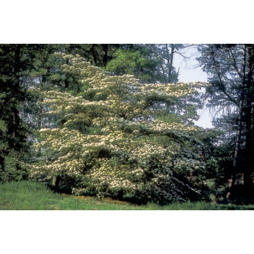 KornoeljeBrede kroon,takken in etages afstaandBlad:breed elliptisch vrij groot,glanzendBloem:roomwit in mei-juliVrucht:donkerblauw,zelden aanwezigFraaie solitair