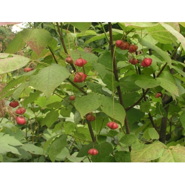 KardinaalshoedRedelijke hoge struikTwijgen met brede,stevige kurklijstenBlad:5-10cm.groenVrucht:rose met rode zadenFraaie solitair