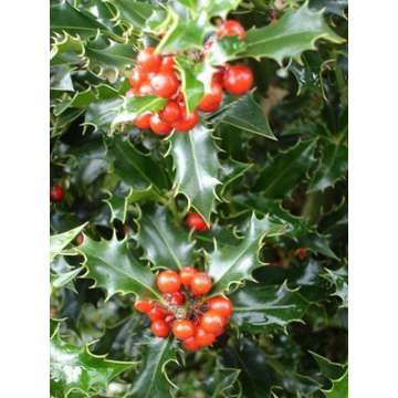 Scherpe HulstHoogte tot 5 mtr.Bloem:wit in aprilBessen:rood.lang aanblijvendZon,halfschaduw,schaduwGeschikt als haag en solitir