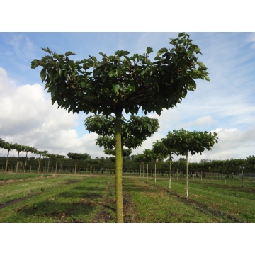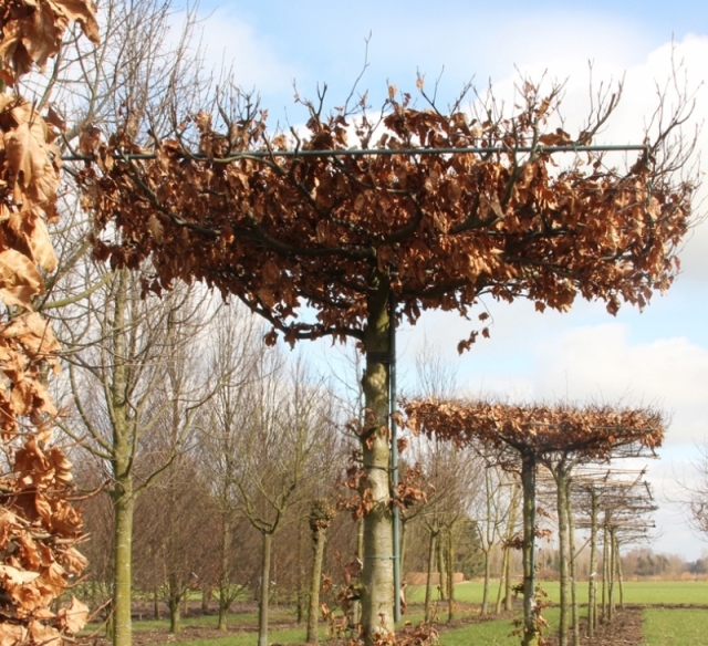 Deze vormbomen zijn vers gemaakt.Dit betekent dat de vorm er net in is gebonden.Als ze iets zwaarder zijn,blijven de takken al horizontaal staan,maar zijn de kosten wat hoger.U heeft dan we direkt meer boom.