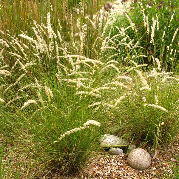 Parelgrasbloem:in pluimen bleekgeelBlad:blauwgrijsHoogte 60cmZonGeschikt als vakbeplanting5st.per m2