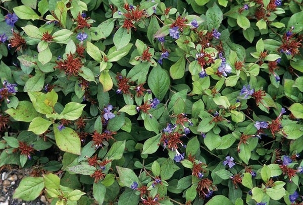 Ceratostigma of Loodkruid zijn goede bodembedekkers in de halfschaduw op een zanderige grond