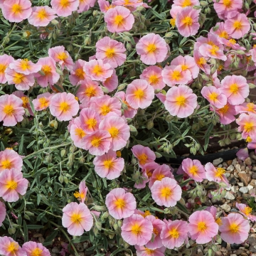 ZonneroosjeHoogte tot 20cm.Bloem:roseBlad:grijsZonDoorlatende,humusrijke grondgeschikt als rotsplant en bodembedekker7st.pm2