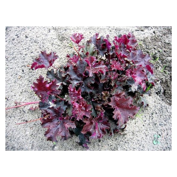 PurperklokjeHoogte tot 50cm.Bloem:créme in juni-augustusBlad:gefranjerd,paarsZon,halfschaduwGeschikt als vakbeplanting7st.per m2