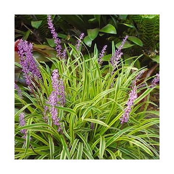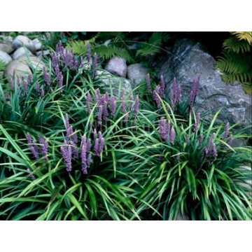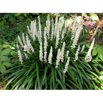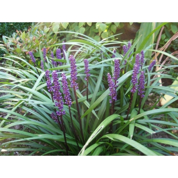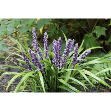 Liriope of Leliegras zijn aparte schaduwplanten met kleine bloemaren en grasachtig blad.