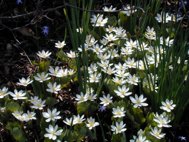 Sanguinaria of Bloedwortel zijn voorjaarsbloeiende schaduwplanten voor een humusrijk,kalkarme grond.